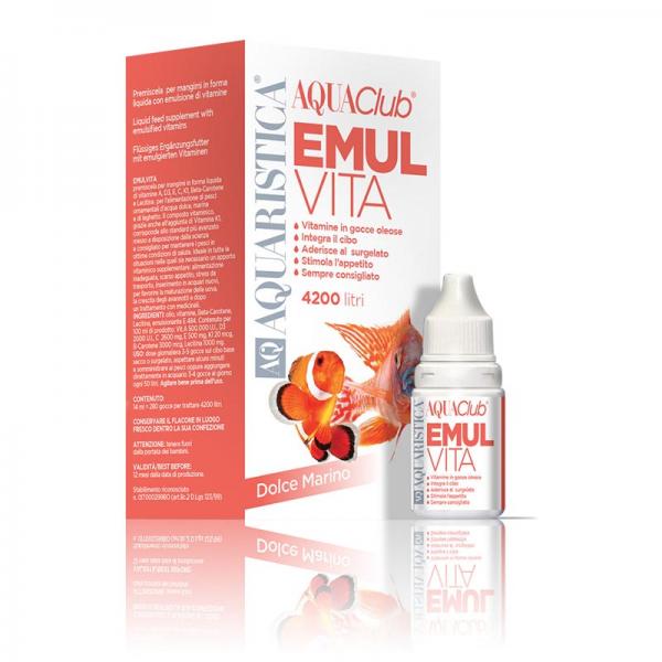 Aquaristica EmulVita, premiscela per mangimi in forma liquida con emulsione di vitamine Vitamine A, D3, E, C, K1, Beta-Carotene e Lecitina per l’alimentazione di pesci ornamentali d’acqua dolce, marina e di laghetto. Il composto vitaminico, grazie anche all’aggiunta di Vitamina K1, corrisponde allo standard più avanzato messo a disposizione dalla scienza e consigliato per mantenere i pesci in ottime condizioni di salute. Ideale in tutte le situazioni nelle quali sia necessario un apporto vitaminico supplementare: alimentazione inadeguata, scarso appetito, stress da trasporto, inserimento in acquari nuovi, per favorire la maturazione delle uova, la crescita degli avannotti e dopo un trattamento con medicinali.
