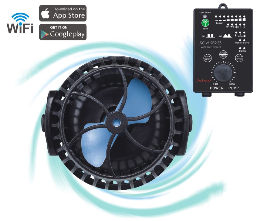 Le pompe di movimento Jebao SOW della serie M sono caratterizzate da un ampio rotore e dalla possibilità di essere controllate sia manualmente tramite comandi sul controller che via WiFi tramite App per dispositivi Android e iOS.