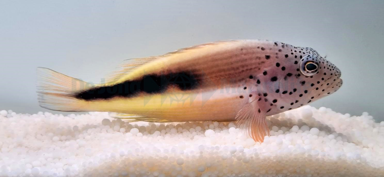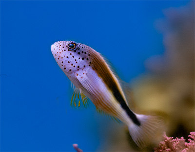 Il Paracirrhites forsteri è uno dei pesci falco più affascinanti: una livrea chiara e delicata attraversata da bande scure e riflessi dorati, che lo rendono subito riconoscibile tra le rocce.