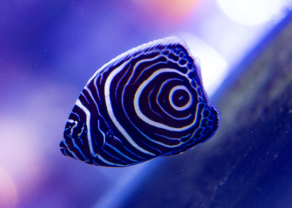 Da giovane, questo angelo imperatore sfoggia una livrea incomparabile: corpo blu intenso con anelli e cerchi bianchi e azzurri concentrici che catturano immediatamente l'attenzione e trasformano ogni acquario in una piccola opera d'arte vivente.
