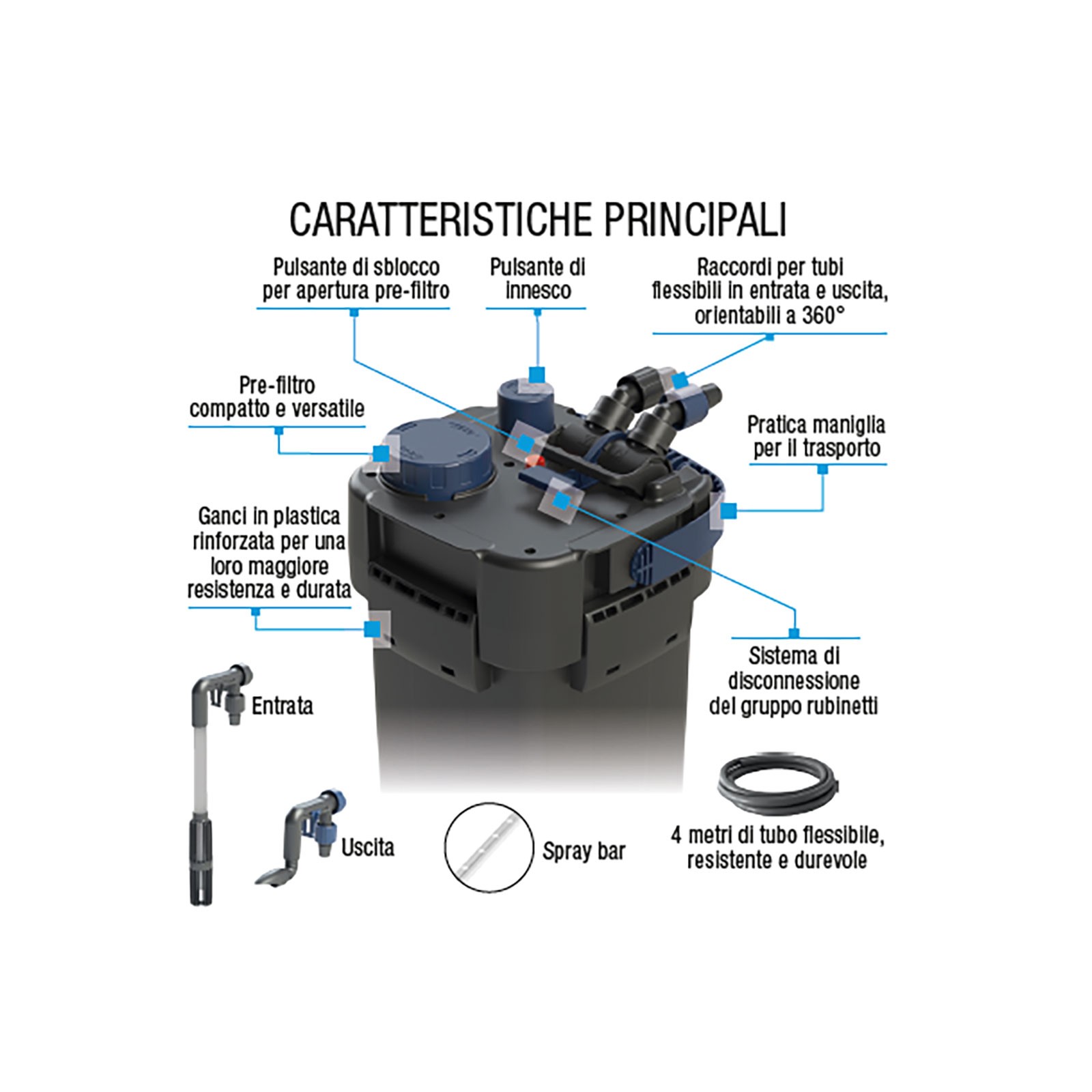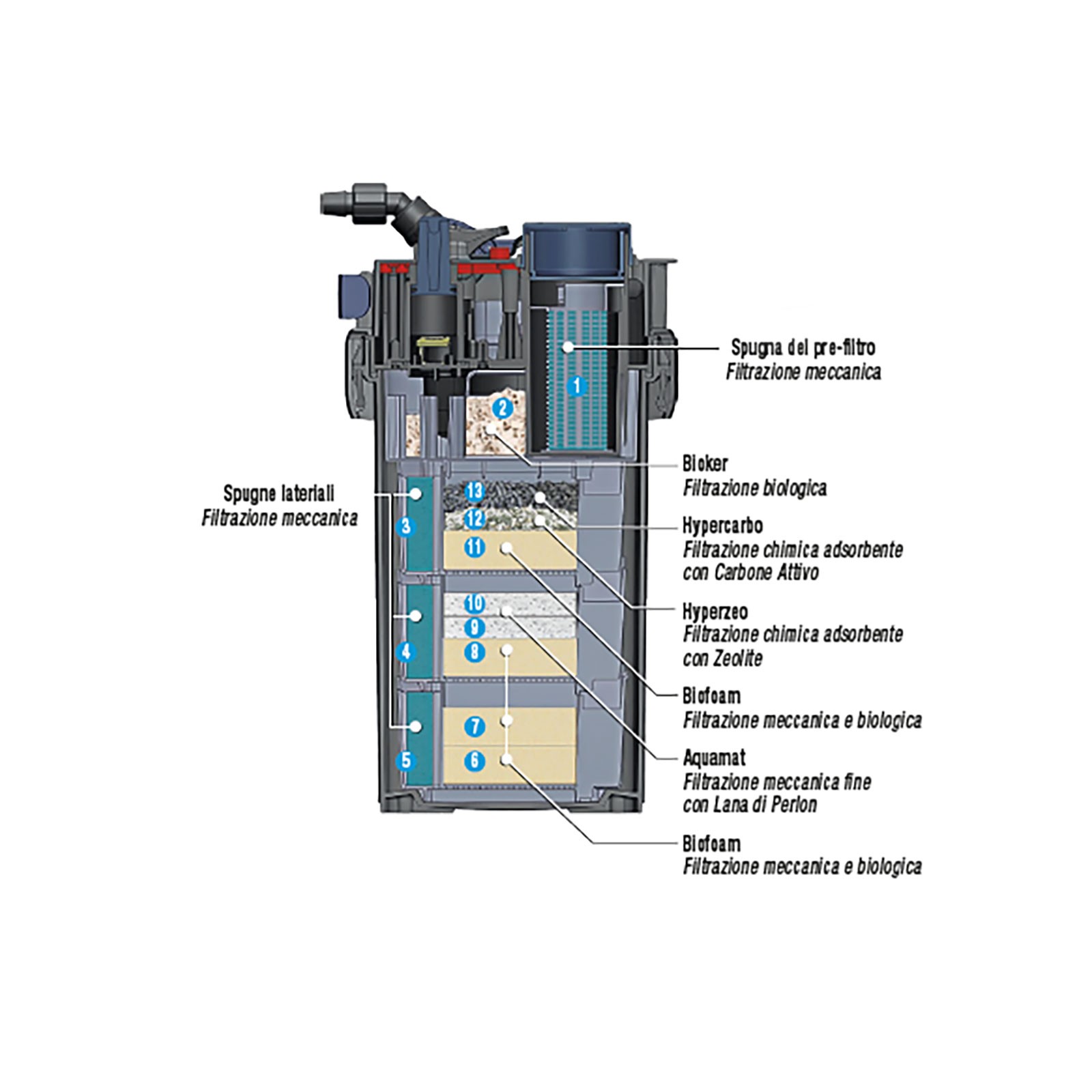 - Include: spugne Biofoam, Hypercarbo, Hyperzeo, Bioker, Aquamat e pre-filtro, tubo da 4 m con diametro da 18 mm, cavo del filtro da 2,2 m