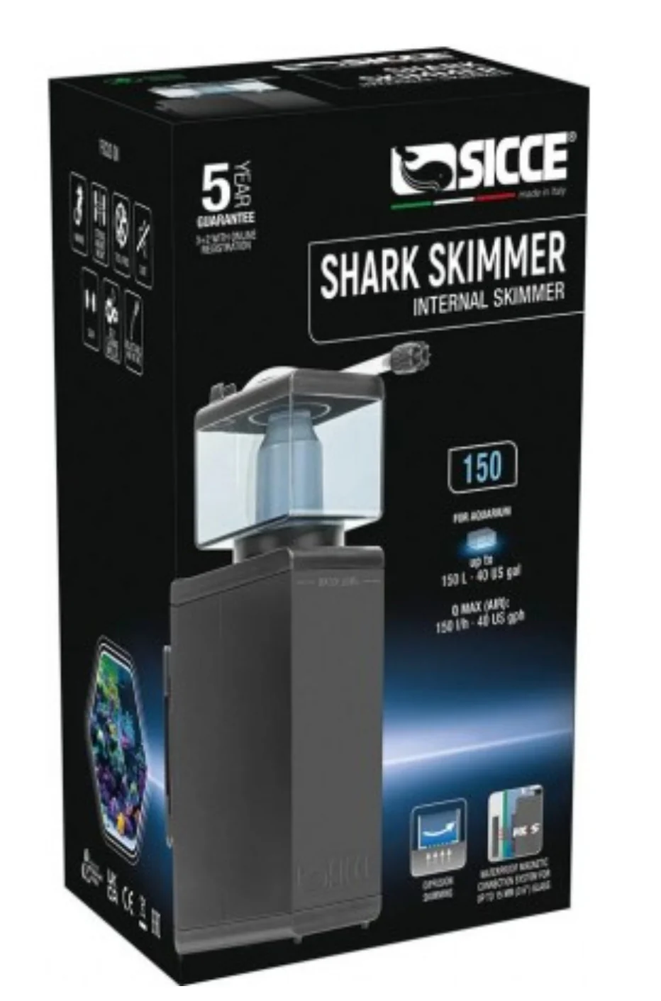 Shark SKIMMER 150 e Shark SKIMMER 300 sono moderni schiumatoi interni con un design molto compatto e innovativo per un'integrazione diretta nei biotopi marini. Provengono dagli ultimi sviluppi e conoscenze nel campo della barriera corallina e sono progettati per acquari fino a 150 e 300 litri, a seconda del carico e del tipo di biotopo. Il loro consumo energetico, molto basso, li rende gli schiumatoi più competitivi sul mercato per questa capacità di schiumazione. Sono estremamente silenziosi, facili da usare e facili da disassemblare.