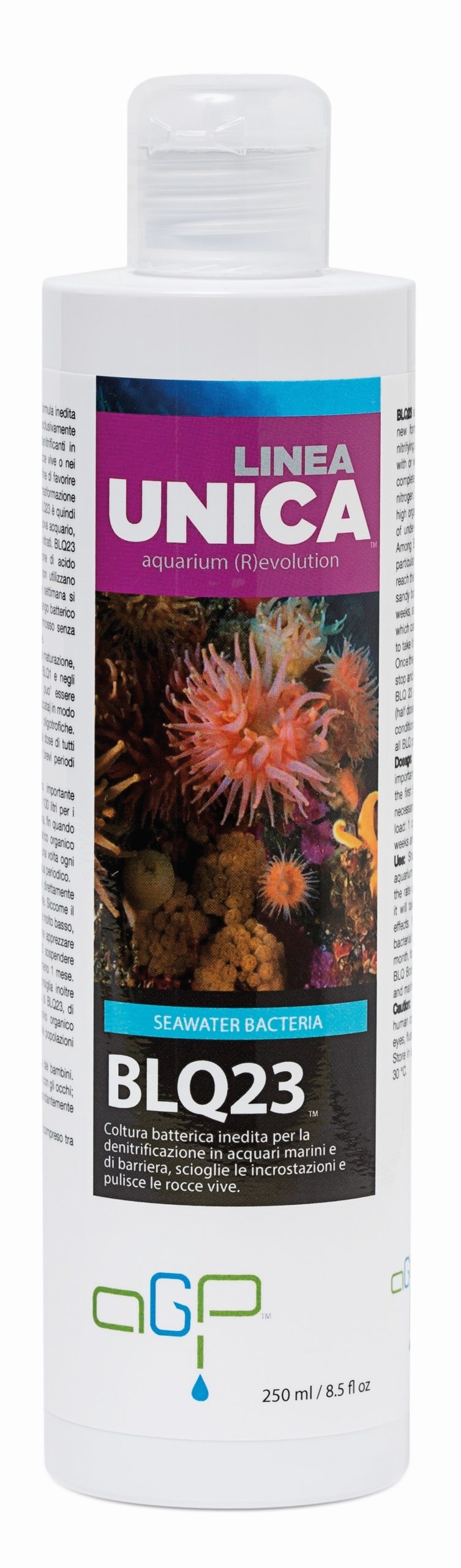 BLQ23 è una coltura batterica dalla formula inedita specificamente studiata per inserire esclusivamente popolazioni di batteri nitrificanti e denitrificanti in acquario, fino ai pori interni delle rocce vive o nei fondi sabbiosi (sia bassi sia DSB), al fine di favorire una denitrificazione ottimale tramite trasformazione del nitrato (NO3) in azoto gassoso. BLQ23 è quindi consigliato nei casi di installazione di nuovi acquari, maturazione rocce vive o presenza di nitrati. BLQ23 non provoca l’aumento di produzione di acido solfidrico, in quanto i suoi batteri non utilizzano zolfo come riducente. Dopo qualche settimana si potrebbe anche notare l’aumento di fango batterico che, irrilevante, può anche essere rimosso senza però agitarlo o portarlo in sospensione.